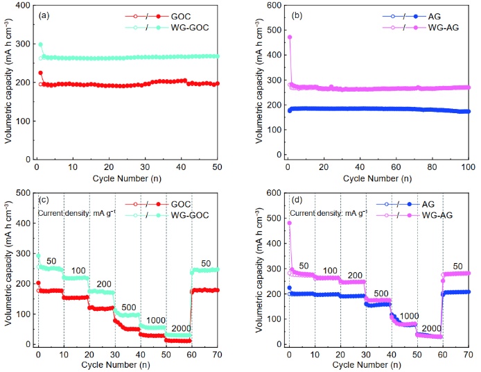 電化學(xué)結(jié)果表明(圖3),在50mAg-1的電流密度下,造粒后的WG-GOC和WG-AG相比于各自的石墨原料,體積比容量分別增加了35%和55%。更讓人驚訝的結(jié)果是,在1000mAg-1和2000mAg-1的大電流密度下,相比GOC,WG-GOC的體積比容量分別提升了94.4%和165.7%。此外,得益于高剪切濕造粒加工時(shí)間短、造粒效率高等優(yōu)點(diǎn),該研究提供了一種制備高振實(shí)密度石墨負(fù)極的簡(jiǎn)便方法,具有良好的工業(yè)化前景。