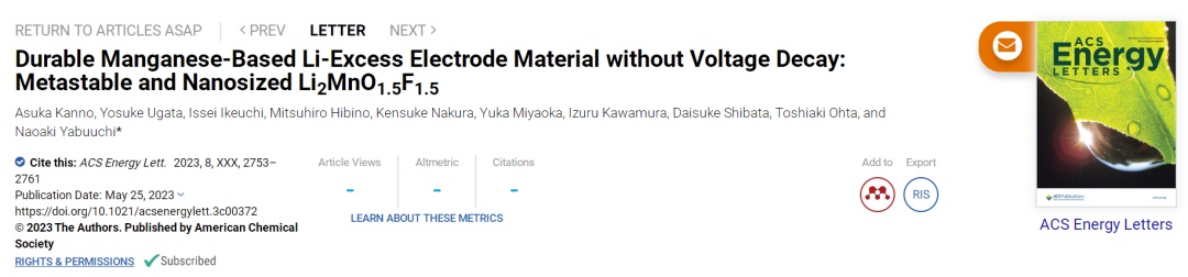 Asuka Kanno, Yosuke Ugata, Issei Ikeuchi, Mitsuhiro Hibino, Kensuke Nakura, Yuka Miyaoka, Izuru Kawamura, Daisuke Shibata, Toshiaki Ohta, and Naoaki Yabuuchi* Durable Manganese-Based Li-Excess Electrode Material without Voltage Decay: Metastable and Nanosized Li2MnO1.5F1.5 ACS Energy Lett. 2023, 8, XXX, 2753–2761