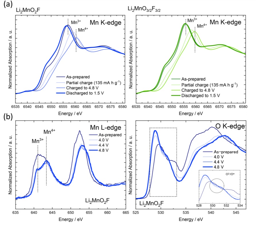 【圖3】(a)對(duì)Li2-yMnO2F和Li2-yMnO1.5F1.5的Mn K邊XAS光譜在電化學(xué)循環(huán)中的變化。(b)觀察不同充電狀態(tài)下Li2-yMnO2F的Mn L邊和O K邊XAS光譜。