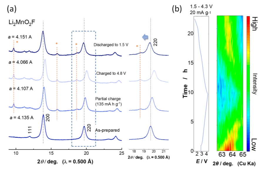 【圖4】利用(a)外部同步輻射X射線衍射和(b)原位X射線衍射研究Li2-yMnO2F的結(jié)構(gòu)變化。在原位XRD數(shù)據(jù)上顯示了2 0衍射線的輪廓圖,該數(shù)據(jù)在20 mA g-1的速率下進(jìn)行,具有4.3 V截止。充電后出現(xiàn)了用星號(hào)標(biāo)記的未知峰,但由于在電化學(xué)循環(huán)中沒(méi)有峰移,該相似乎是電化學(xué)不活躍的。