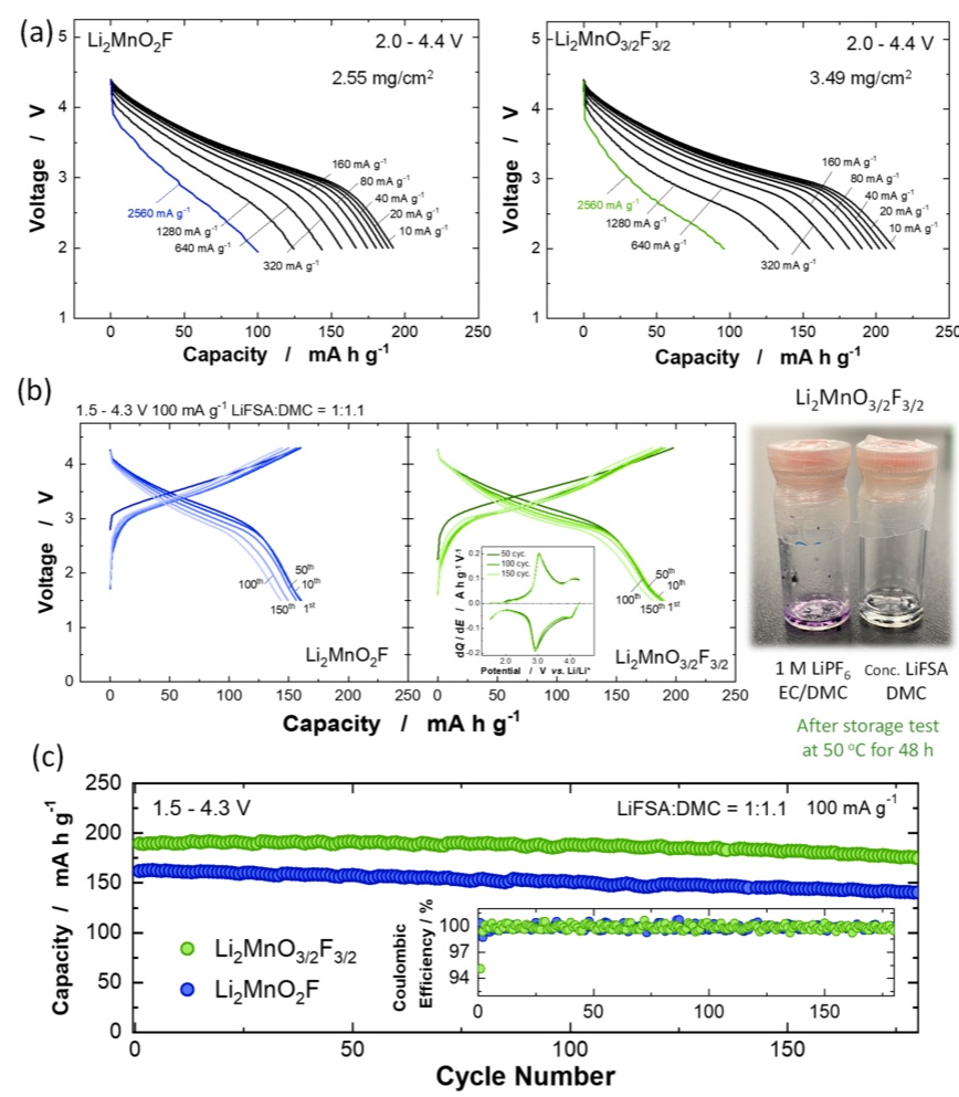 【圖5】(a) Li2MnO2F和Li2MnO1.5F1.5的速率能力比較。在100 mA h g-1的速率和4.3 V截止電壓下,使用濃縮電解液測(cè)試Li2MnO2F和Li2MnO1.5F1.5的電極可逆性。(b)充放電曲線和不同電解液儲(chǔ)存后的樣品圖片。(c) 容量保留率和庫(kù)倫效率。在常規(guī)電解液中,使用4.3 V截止電壓得到的電化學(xué)數(shù)據(jù)在支持信息的圖S5c和S5d中。