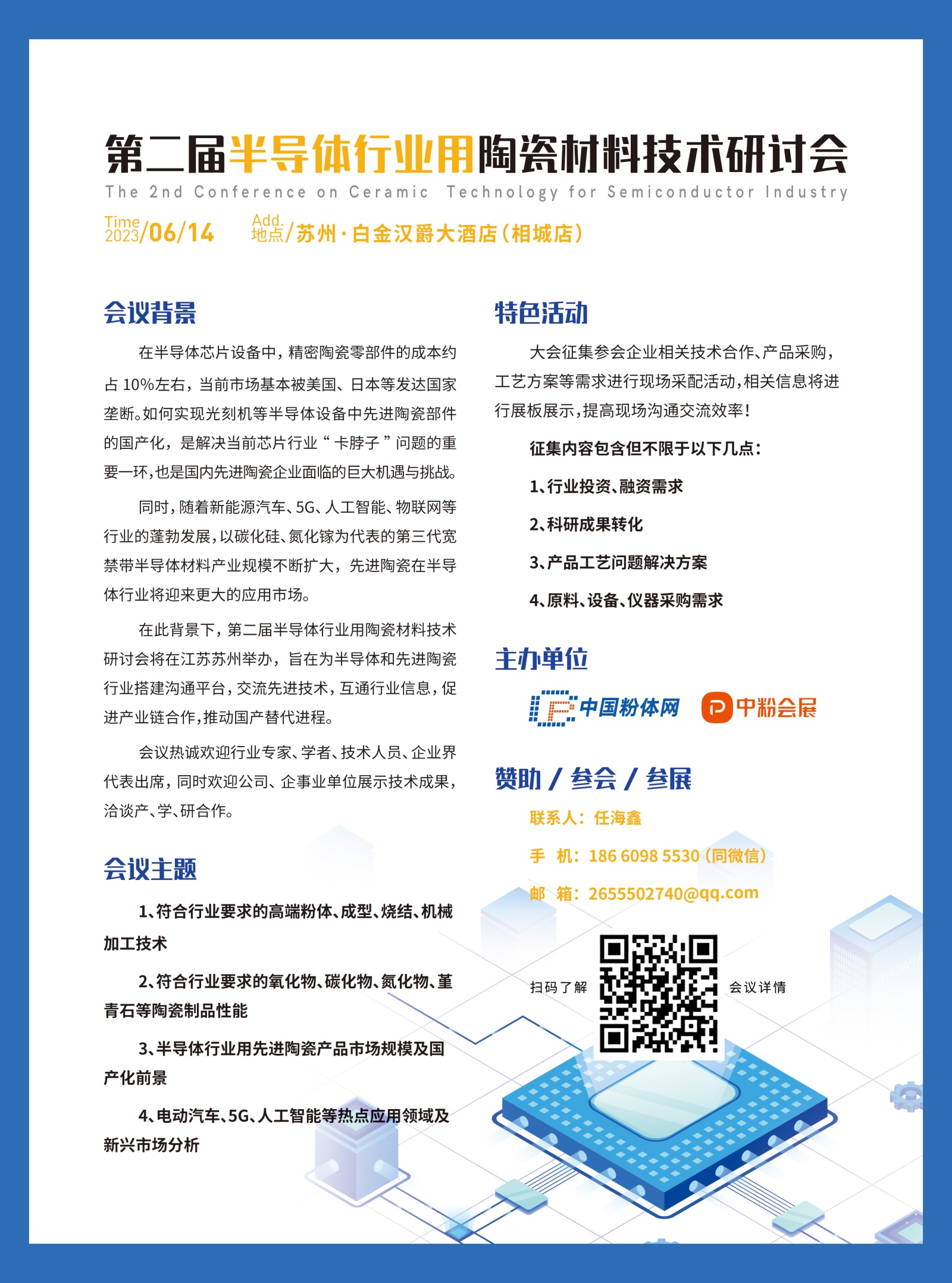 從第二屆半導體行業(yè)用陶瓷材料技術研討會組委會獲悉,本屆會議將于2023年6月14日在蘇州舉辦。湖南維尚科技有限公司作為參展單位邀請您共同出席。