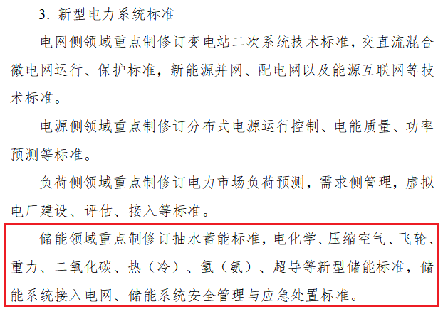 《碳達(dá)峰碳中和標(biāo)準(zhǔn)體系建設(shè)指南》在碳減排標(biāo)準(zhǔn)子體系板塊第3點,專門就新型電力系統(tǒng)儲能領(lǐng)域做了標(biāo)準(zhǔn)建設(shè)的明確指示:儲能領(lǐng)域重點制修訂抽水蓄能標(biāo)準(zhǔn),電化學(xué)、壓縮空氣、飛輪、重力、二氧化碳、熱(冷)、氫(氨)、超導(dǎo)等新型儲能標(biāo)準(zhǔn),儲能系統(tǒng)接入電網(wǎng)、儲能系統(tǒng)安全管理與應(yīng)急處置標(biāo)準(zhǔn)。