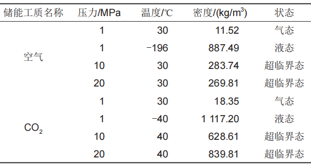 由于CO2臨界點(7.39MPa和31.4℃)相對空氣(3.77MPa和-140.5℃)容易達(dá)到,無毒、不易燃、安全等級為A1。且超臨界二氧化碳(S-CO2)具有優(yōu)良的熱力學(xué)性質(zhì):黏度小、密度大、導(dǎo)熱性能好,系統(tǒng)寄生能耗也相對較低。基于常規(guī)儲能設(shè)計參數(shù),下表展示了不同壓力和對應(yīng)溫度下空氣和CO2的密度大小,可以看出,相同狀態(tài)和壓力下CO2儲存密度均大于空氣,其中液態(tài)儲存時最高,從而使得二氧化碳儲能系統(tǒng)具有較高的儲能潛力。