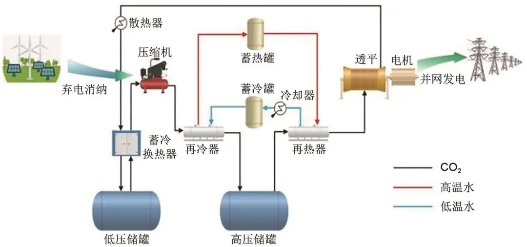 其工作原理可分為儲能階段和釋能階段兩個過程。儲能時,低壓儲罐中的低壓液態(tài)CO2經(jīng)過蓄冷換熱器吸熱氣化,再經(jīng)過(多級)壓縮機壓縮至超臨界狀態(tài),同時通過再冷器吸收壓縮熱并通過蓄熱介質(zhì)將熱量儲存在蓄熱罐中,最后將超臨界狀態(tài)CO2儲存在高壓儲罐中,即將電能以熱能和勢能形式儲存;釋能時,高壓儲罐中的超臨界CO2經(jīng)過再熱器升溫,再進入透平中推動透平發(fā)電,同時再將再熱器出口的低溫蓄熱介質(zhì)冷量儲存在蓄冷罐中,末級透平出口的CO2再經(jīng)過冷卻器和蓄冷換熱器冷卻至液化狀態(tài),最后儲存在低壓儲罐,即將熱能和勢能轉(zhuǎn)化為電能輸出。