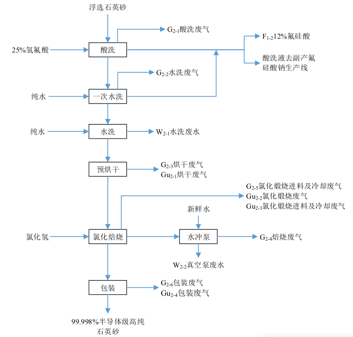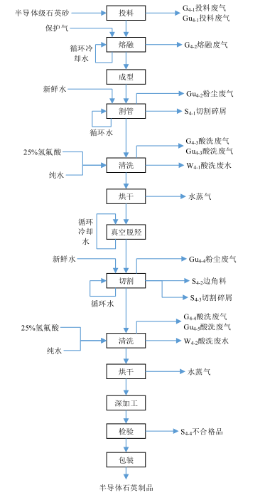 酸洗、純水沖洗、烘干:把加工成型的石英管及器件放入盛有12%的氫氟酸(25%氫氟酸+水)酸洗槽中酸洗,酸洗槽中酸液循環(huán)使用,定期補(bǔ)充,無廢酸液產(chǎn)生。該工序有氟化氫廢氣產(chǎn)生。酸洗過后的產(chǎn)品,表面附著少量酸液,放入清洗槽用高純水清洗,去除表面附著的酸液,此工序產(chǎn)生含氟廢水。清洗過后的產(chǎn)品,經(jīng)廠區(qū)烘干系統(tǒng)烘干,烘干系統(tǒng)采用電加熱,去除產(chǎn)品表面的殘留水分,在烘干過程中會(huì)產(chǎn)生少量水蒸氣。
