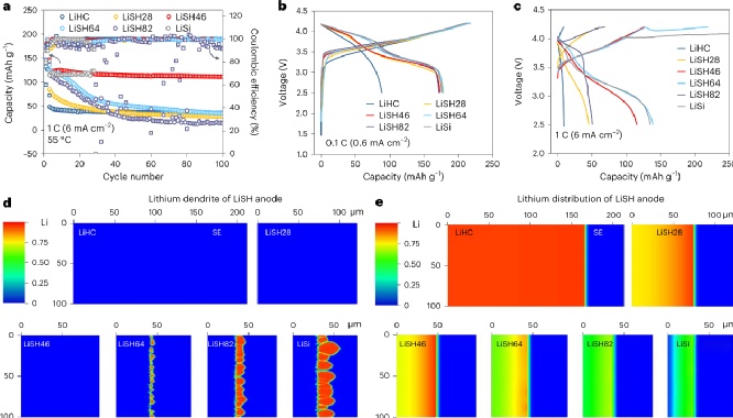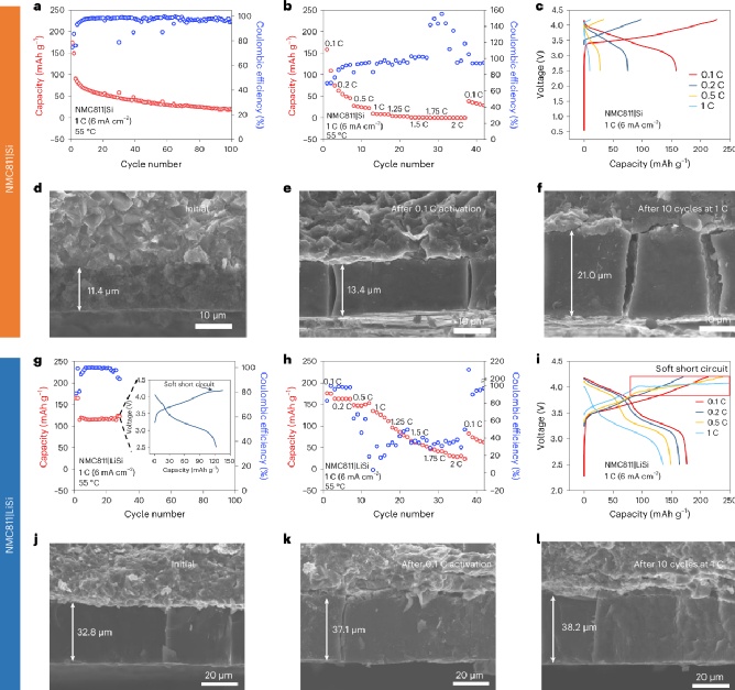 圖1|Si負(fù)極和Li-Si合金負(fù)極的電化學(xué)性能以及切面SEM圖