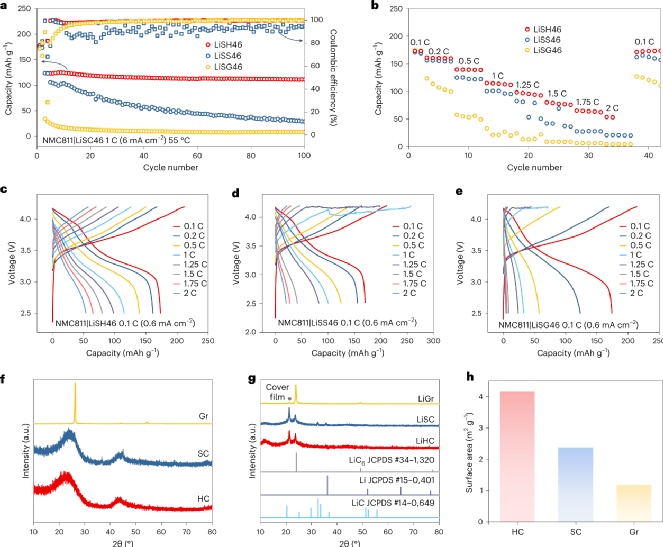 將LiSH46負(fù)極中的硬碳替換為軟碳(LiSS46)和石墨(LiSG46),組裝硫化物全固態(tài)電池,在大電流下仍然發(fā)生了微短路,且LiSG46的全固態(tài)電池循環(huán)表現(xiàn)了較低的容量。LiSH46負(fù)極中,硬碳具有相較于石墨和軟碳更大的無序度、層間距和比表面積,為鋰析出提供了大量位點(diǎn)。另外由于硬碳接近0V的嵌鋰平臺(tái)以及更高的鋰擴(kuò)散系數(shù),誘導(dǎo)鋰遷移進(jìn)入電極內(nèi)部,并從硬碳的表面均勻析出。所以硬碳可以更有效地抑制鋰硅合金鋰沉積過程的枝晶生長。