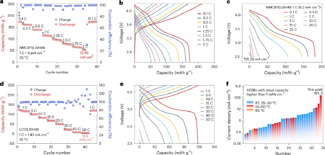 硬碳穩(wěn)定化鋰硅合金負(fù)極組裝全固態(tài)電池,可以實(shí)現(xiàn)優(yōu)異的倍率性能。匹配6.48mAhcm-2的NMC811正極,可以在12.96mAcm-2的電流密度下充放電,不發(fā)生明顯的微短路。匹配1.43mAhcm-2的LCO正極,可以在71.5mAcm-2的電流密度下充放電,不發(fā)生明顯的微短路。