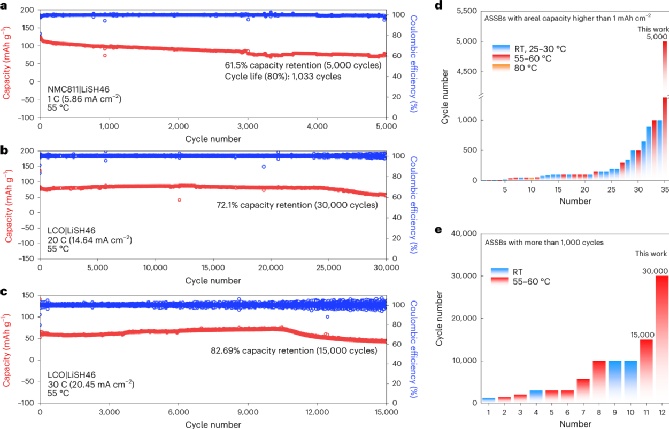 硬碳穩(wěn)定化鋰硅合金負(fù)極組裝硫化物全固態(tài)電池,可以實(shí)現(xiàn)優(yōu)異的長循環(huán)性能。匹配5.86mAhcm-2的NMC811正極,可以在5.86mAcm-2(1C)下循環(huán),首周可逆容量達(dá)3.6mAhcm-2,循環(huán)壽命為1033圈,在循環(huán)3000(5000)圈后容量保持70%(61.5%)。匹配0.73mAhcm-2的LCO正極,可以在14.64mAcm-2(20C)和20.45mAcm-2(30C)下循環(huán)30000周和15000周,容量分別保持72.1%和80%。