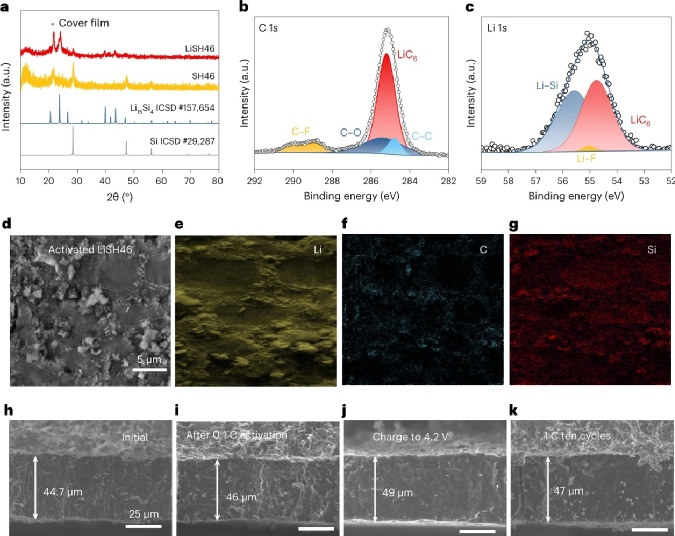 通過XRD、XPS、AES和截面SEM對(duì)LiSH46負(fù)極進(jìn)行進(jìn)一步表征,由于Si的邊界融合反應(yīng),Si和硬碳都失去了原始的規(guī)則形貌,形成了交聯(lián)結(jié)構(gòu)。電極含有Li15Si4和LiC6富鋰相構(gòu)成導(dǎo)電網(wǎng)絡(luò),增大了電極活性面積。且由于富鋰相的易形變特性,使得電極結(jié)構(gòu)穩(wěn)定性提升。如截面SEM顯示,電極循環(huán)前后厚度變化不大,且裂紋數(shù)量明顯少于Si負(fù)極。