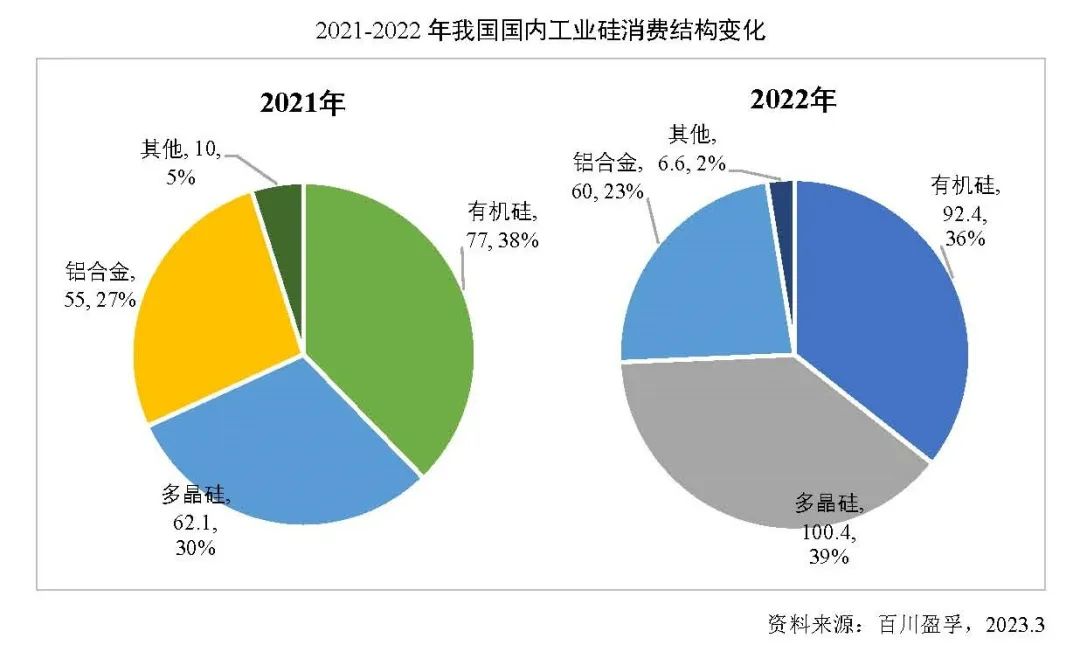 工業(yè)硅下游需求中,多晶硅、有機硅以及鋁合金領(lǐng)域?qū)I(yè)硅消耗較大。其中,2022年,多晶硅消耗工業(yè)硅達(dá)到100.4萬噸,超越有機硅成為第一消費領(lǐng)域,占比39%,較2021年上升9個百分點;有機硅消耗工業(yè)硅92.4萬噸,占比36%,下降2個百分點;鋁合金消耗工業(yè)硅60萬噸,占比23%,下降4個百分點。