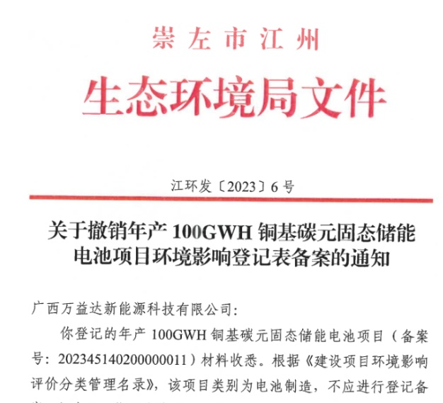 6月13日,崇左市江州生態(tài)環(huán)境局發(fā)布《關(guān)于撤銷年產(chǎn)100GWH銅基碳元固態(tài)儲(chǔ)能電池項(xiàng)目環(huán)境影響登記表備案的通知》。通知顯示,該項(xiàng)目違反了《建設(shè)項(xiàng)目環(huán)境影響登記表備案管理辦法》第十六條規(guī)定,項(xiàng)目已經(jīng)取得的備案無(wú)效,予以撤銷。據(jù)悉,該項(xiàng)目由廣西云桂新能源科技有限公司投資建設(shè),項(xiàng)目規(guī)劃總投資300億元,分三期建設(shè)。