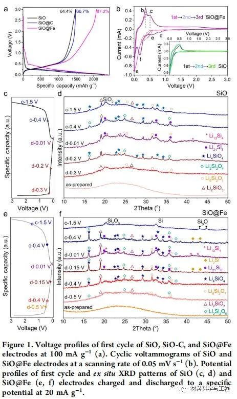 圖1(a)SiO、SiO-C和SiO@Fe的電極首周曲線,(b)SiO和SiO@Fe電極的CV曲線,(c-f)SiO和SiO@Fe的原位XRD圖