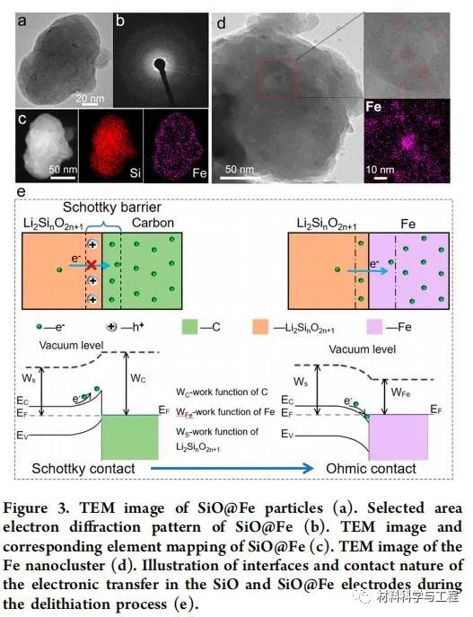 在此,作者報(bào)告了一種顯著提高SiO負(fù)極首次庫(kù)侖效率的方法,通過(guò)CVD工藝在SiO表面包覆一層均勻的Fe納米團(tuán)簇,形成的核/殼結(jié)構(gòu)能解決SiO的首次庫(kù)侖效率問(wèn)題;诰哂袣W姆接觸和電子隧道效應(yīng)的界面設(shè)計(jì),分散良好的Fe納米團(tuán)簇可以激活初始鋰化過(guò)程中產(chǎn)生的Li2SinO2n+1的脫鋰反應(yīng),并使鋰離子能夠在脫鋰過(guò)程中從硅酸鹽中釋放,從而提高SiO電極的首次庫(kù)侖效率。相比原始SiO64.4%的初始庫(kù)倫效率,通過(guò)3.3%的Fe納米團(tuán)簇包覆,SiO@Fe負(fù)極材料實(shí)現(xiàn)了87.2%的高首效,約提高23%,優(yōu)于最近關(guān)于SiO負(fù)極的最佳報(bào)道(除了預(yù)鋰化),同時(shí),F(xiàn)e納米團(tuán)簇包覆顯著提高了SiO電極的倍率性能和循環(huán)穩(wěn)定性。這項(xiàng)工作提供了一種有效的方法來(lái)解決由于惰性鋰化產(chǎn)物的形成而導(dǎo)致的SiO電極的低首效問(wèn)題。(文:李澍)