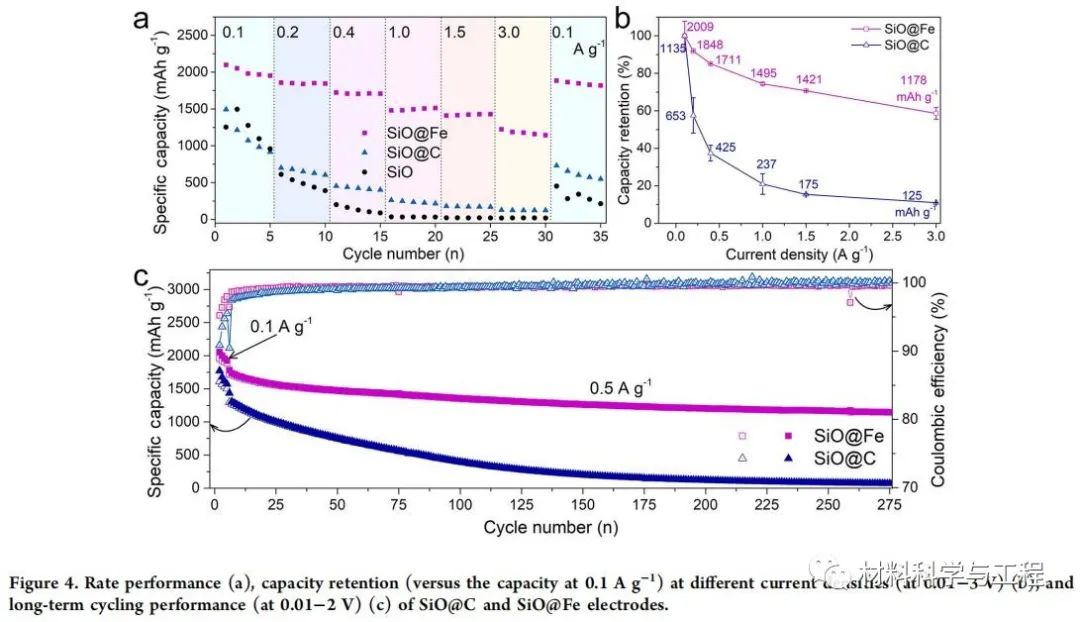 圖4SiO@C和SiO@Fe電極的倍率性能和長(zhǎng)循環(huán)性能