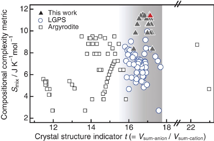 圖1|所報(bào)道的LGPS型(空心圓圈)和硫銀鍺礦型(空心方塊)電解質(zhì)的晶體結(jié)構(gòu)指標(biāo)(t,陰離子與陽(yáng)離子的體積比)與成分復(fù)雜性度量(Smix)之間的關(guān)系。