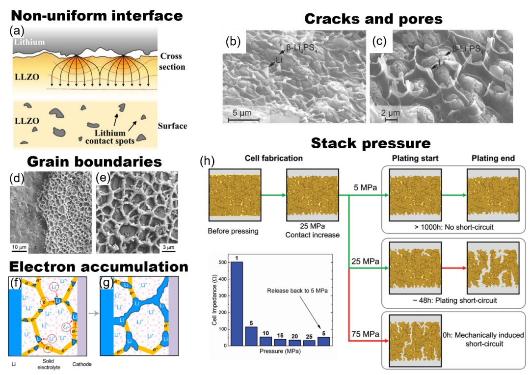 圖1.(a)SE和Li金屬之間的不均勻界面接觸導致熱點處的電場放大,從而引發(fā)Li枝晶生長;經(jīng)許可復制,版權所有2019,AmericanChemicalSociety。(b-c)斷裂的LPSSE表面的SEM圖像,顯示在SE聚集體之間的裂紋和孔隙處的Li枝晶生長;經(jīng)許可復制,版權所有2017,WILEY¬CHVerlagGmbH&Co.KGaA,Weinheim(d-e)SEM圖像顯示了沿石榴石SE晶界的Li枝晶生長;經(jīng)許可復制,版權所有2016,ElsevierLtd。(f-g)示意圖表明,晶界處的小禁帶和電子積累導致鋰枝晶生長;經(jīng)許可復制,版權所有2021,Xiao ming Liu etal.under exclusive licence to Springer Nature Limited。(h)示意圖顯示了堆疊壓力對SE中鋰枝晶擴展和電池阻抗的影響。經(jīng)許可復制,版權所有2019,WILLEY¬CHVerlagGmbH&Co.KGaA,Weinheim