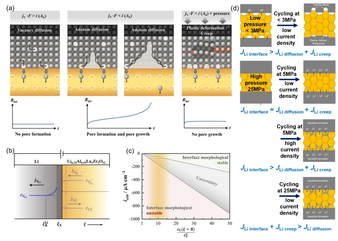 圖2.(a)示意圖顯示,如果剝離電流密度超過Li空位的擴散極限,則在Li/SE界面處形成空洞,外部壓力導致Li蠕變,從而阻止空洞形成;(b)顯示Li空位擴散的示意圖,在Li金屬中由Li空位濃度梯度控制;(c)CCD相對于SE/Li界面處的Li空位濃度與體相Li金屬中的平衡Li空位濃度之間的比率的變化;(a-c)經(jīng)許可復制,版權所有2019,AmericanChemicalSociety。(d)施加的壓力和電流密度影響電化學反應導致的界面Li離子遷移、Li蠕變導致的Li擴散和體相Li金屬中空位促進的Li擴散之間的關系,這決定了SE/Li界面處的空位和Li枝晶的形成。經(jīng)許可復制。[85]版權2020,AmericanChemicalSociety。