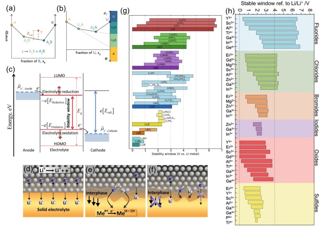 圖3.(a)顯示元素A和B之間相穩(wěn)定性的巨電勢相圖;(b)揭示A在不同Li化學勢下穩(wěn)定性的巨電勢相圖;(a-b)經(jīng)許可復制。[99]版權所有2018,ElsevierInc.(c)陽極鋰化學勢高于電解質(zhì)還原極限導致電解質(zhì)的鋰化和還原,陰極鋰化學勢低于電解質(zhì)氧化極限導致電解質(zhì)的脫鋰和氧化;經(jīng)許可復制,版權2018,RoyalSocietyofChemistry。(d)不發(fā)生SE分解的理想SE/Li界面有助于快速鋰離子傳輸;(e)SE分解形成的混合導電界面導致界面處持續(xù)SE分解;(f)具有低Li離子電導率的純Li離子導電界面相阻礙Li離子傳輸?shù)种芐E進一步分解;(d-f)經(jīng)許可復制,版權所有2015,ElsevierB.V.(g)理論計算各種SE的電化學穩(wěn)定性窗口;經(jīng)許可復制,版權所有2015,AmericanChemicalSociety。(h)理論計算具有不同陽離子的各種SE的電化學穩(wěn)定性窗口。經(jīng)許可復制,版權所有2019,Wiley¬CHVerlagGmbH&Co.KGaA,Weinheim