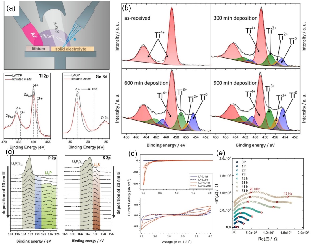 圖4.(a)NASICON型SE的原位XPS裝置和Ti2p和Ge3d的光譜示意圖;經(jīng)許可復制,版權所有2013,AmericanChemicalSociety。(b)原位XPS光譜顯示,在不同Li沉積時間,LLTO中Ti的還原;經(jīng)許可復制,版權所有2015,ElsevierB.V.(c)P2p和S2p原位XPS光譜顯示Li7P3S11的還原以及鋰化后Li3P和Li2S的形成;經(jīng)許可復制,版權2015,ElsevierB.V.(d)循環(huán)伏安法表明,LGPS在第一和第二個循環(huán)中分解,而LPS由于鈍化層的形成而在第二個周期中達到穩(wěn)定;經(jīng)許可復制,版權所有2014,Elsevier。(e)時間分辨阻抗譜顯示,由于Li3InCl6在Li陽極側的連續(xù)還原,對稱Li/Li3InCl6/Li電池的界面電阻隨著時間的增加而增加,光譜疊加有1k的位移且沒有重新縮放。經(jīng)許可復制,版權所有2020,LuiseM.Riegger,etal.AngewandteChemie,WileyVCHGmbH。