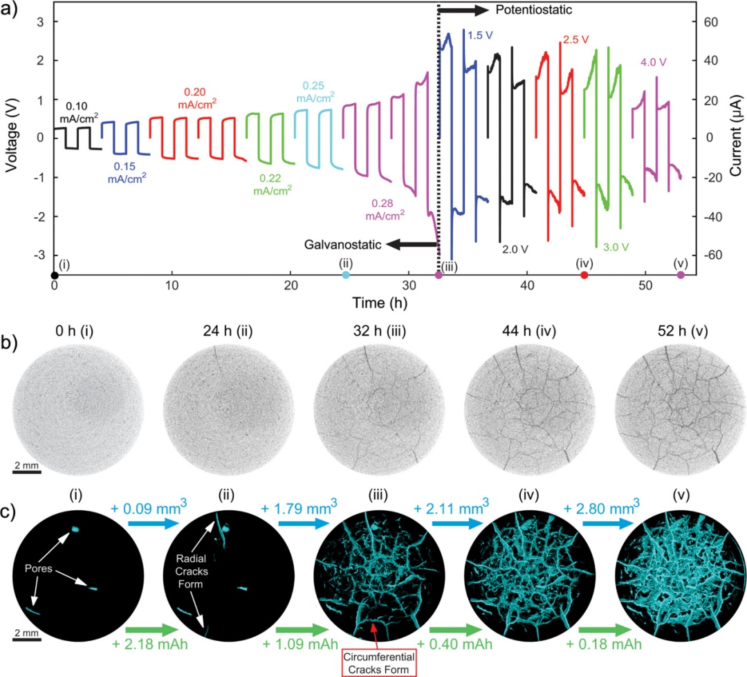 圖5.(a)Li/LAGP/Li對稱電池在不同電流密度下的恒電流充電/放電和不同電壓下的恒電位充電/放電下的電化學性能;(b)SE顆粒中心的X射線CT掃描顯示,隨著電化學循環(huán)時間的增加,裂紋逐漸增多;(c)3D斷層圖顯示了在與(b)中相同的電化學循環(huán)時間下3D裂紋網(wǎng)絡的變化。經(jīng)許可復制,版權所有2019,AmericanChemicalSociety。