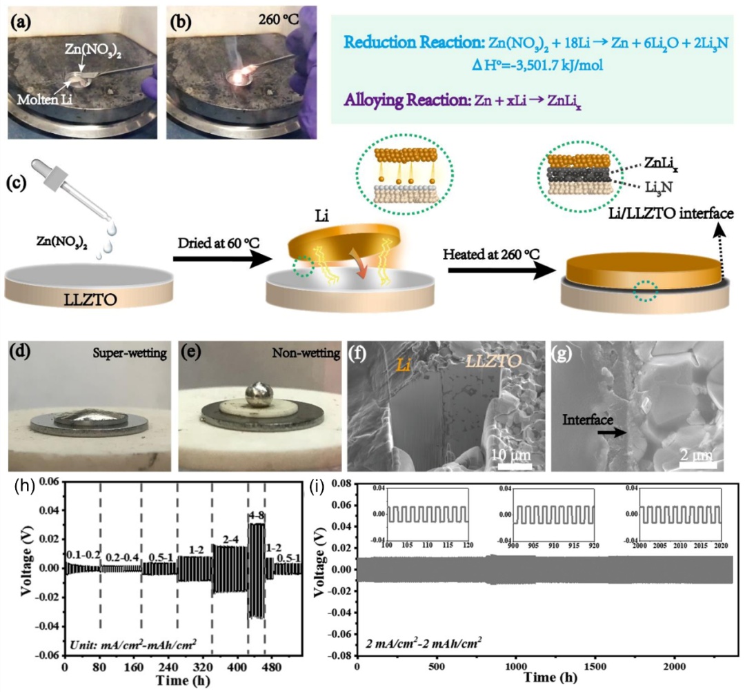 圖6.(a)熔融鋰上沉積Zn(NO3)2;(b)Zn(NO3)2與Li在260℃反應;(c)示意性示出了在Li和LLZO型SE之間制備ZnLix/Li3N基界面層的過程;(d)熔融鋰對含有ZnLix/Li3N涂層的LLZO的浸潤性;(e)熔融鋰對LLZO的潤濕性;(f)SEM顯示Li和ZnLix/Li3N涂覆的LLZO片之間的緊密接觸;(g)(f)中界面周圍的放大視圖;(h)鋰對稱電池在不同電流密度恒電流充/放電下的電化學性能;(i)鋰對稱電池在2mAcm-2恒電流充電/放電下的循環(huán)性能。經(jīng)許可復制,版權2020,WileyVCHVerlagGmbH&Co.KGaA,Weinheim。