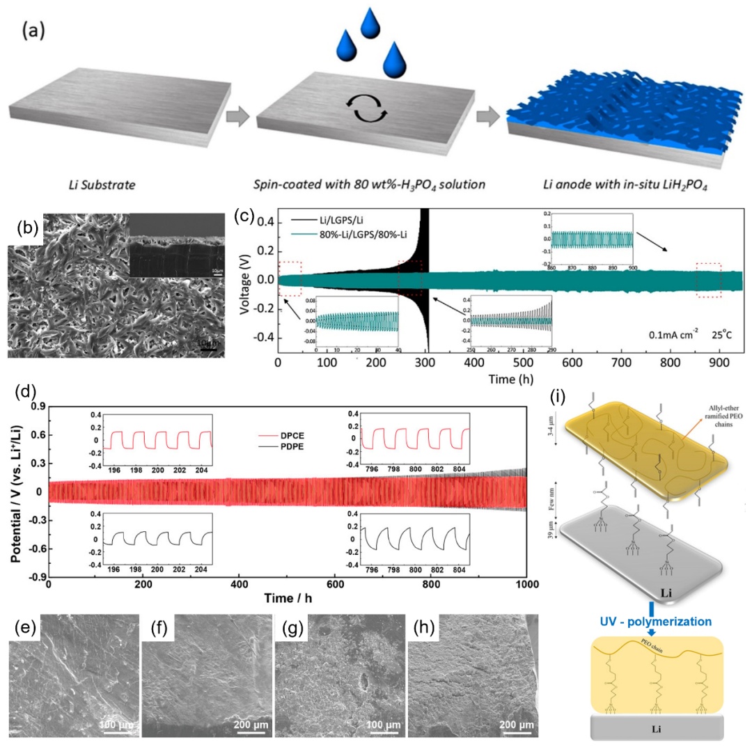 圖7.(a)示意圖顯示了通過旋涂在Li表面上沉積LiH2PO4的過程;(b)SEM顯示了80wt%-H3PO4涂覆的Li的表面形態(tài)和界面;(c)在0.1mAcm-2的恒電流充電/放電下,使用LiH2PO4保護層前后鋰對稱電池的循環(huán)性能;(a-c)經(jīng)許可復制,版權2018,AmericanChemicalSociety。(d)使用PAN/LATP/PEO(DPCE)和PAN/PEO(PDPE)SE的Li對稱電池在恒電流充電/放電下的循環(huán)性能;PAN/LAP/PEOLi陽極的(e)頂視圖和(f)側視圖的SEM;(g)PAN/PEOLi陽極的頂視圖和(h)側視圖;(d-h)經(jīng)許可復制,版權2019,AmericanChemicalSociety。(i)示意圖顯示了通過UV輔助聚合增強的PEO/Li金屬界面。經(jīng)許可復制,版權所有2019KarimZaghibetal.,WileyVCHVerlagGmbH&Co.KGaA。