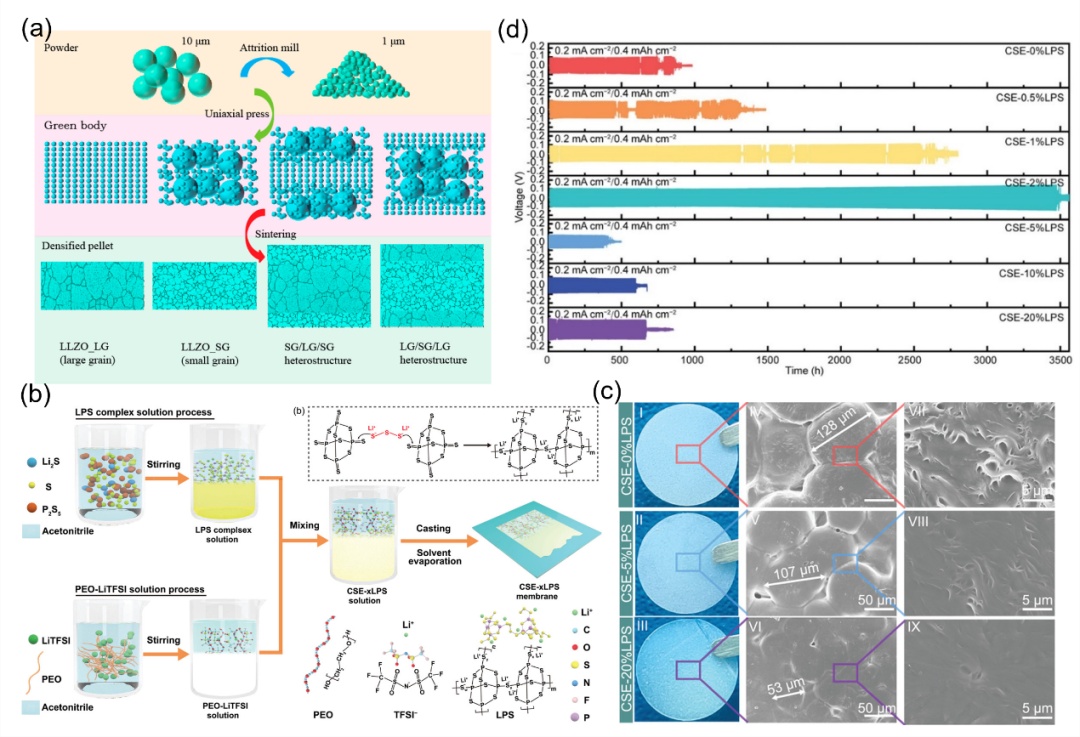 圖8.(a)顯示了制造具有不同晶粒尺寸的LLZO的程序示意圖;經(jīng)許可復制,版權所有2015,AmericanChemicalSociety。(b)生產(chǎn)LPS–PEO–LiTFSI復合固體電解質(zhì)(CSE)膜的實驗程序示意圖;(c)顯示LPS–PEO–LiTFSI復合固體電解質(zhì)膜表面形態(tài)的光學和SEM圖像;(d)使用LPS–PEO–LiTFSI復合固體電解質(zhì)膜(具有不同LPS含量)在0.2mAcm-2恒電流充電/放電下的Li對稱電池的循環(huán)性能。(b-d)經(jīng)許可復制,版權所有2022,WileyVCHGmbH。