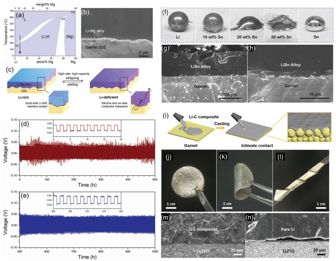 圖9.(a)Li-Mg合金的相圖;(b)SEM圖像顯示了Li-Mg合金和石榴石SE之間的緊密接觸;(c)示意圖顯示了在Li沉積/剝離之后在Li-Mg/石榴石SE界面處保持緊密接觸;Li-Mg/Ta摻雜LLZO/Li-Mg對稱電池在(d)1mAcm-2和(e)2mAcm-2恒電流充放電下的循環(huán)性能;(a-e)經(jīng)許可復制,版權2018,WILEY-VCHVerlagGmbH&Co.KGaA,Weinheim。(f)不同Sn含量的熔融Li-Sn合金對LLZO型SE的潤濕性;(g-h)顯示Li-Sn和LLZO型SE之間緊密接觸的SEM圖像;(f-h)經(jīng)許可復制,版權所有2017,WILEY-VCHVerlagGmbH&Co.KGaA,Weinheim。(i)示意圖顯示了鋰-石墨復合材料對摻雜Ta的LLZO的高潤濕性;(j-l)顯示鋰-石墨復合材料的高柔性的光學圖像;SEM圖像顯示(m)Li石墨復合物/(n)純Li和摻雜Ta的LLZO之間的接觸。(i-n)經(jīng)許可復制,版權所有2019,WILEY-VCHVerlagGmbH&Co.KGaA,Weinheim。