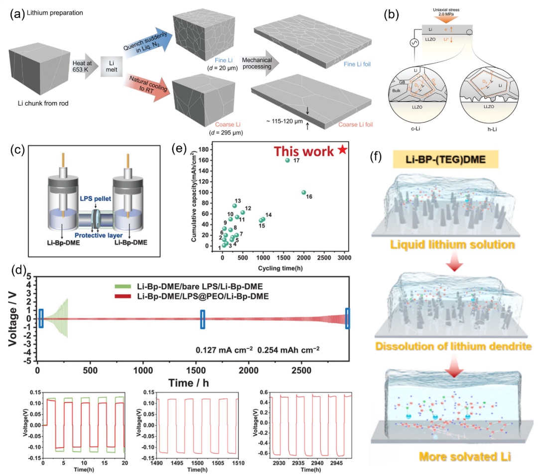 圖10.(a)示意圖顯示了制造具有不同晶粒尺寸的Li箔的程序;(b)顯示晶粒尺寸對Li蠕變影響的示意圖;(a-b)經(jīng)許可復制,版權2022,Janeketal.,WileyVCHGmbH。(c)示意圖顯示了用于Li-Bp-DME液體溶液陽極的自制電池;(d)Li-Bp-DME對稱電池在0.127mAcm-2恒電流充放電下的循環(huán)性能;(e)Li-Bp-DME與其他液體溶液陽極的性能比較;(c-e)經(jīng)許可復制,版權所有2021,Wiley-VCHGmbH.(f)示意圖顯示了Li-Bp-DME在溶解鋰枝晶中的作用。經(jīng)許可復制,版權所有2022,ElsevierB.V.。