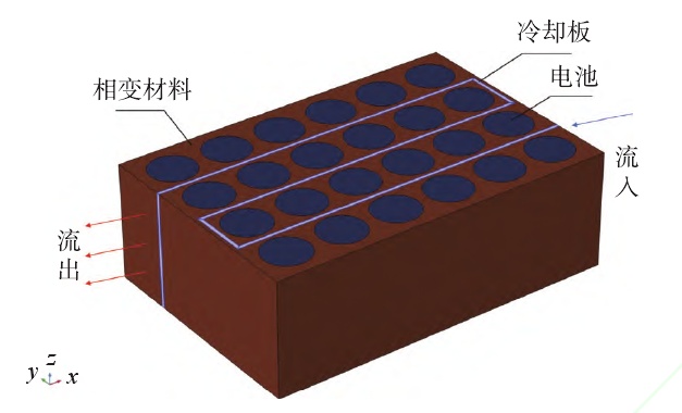 上海理工大學(xué)的姜鑫鑫等人,設(shè)計(jì)了一種相變材料和液冷板復(fù)合的冷卻結(jié)構(gòu),在高放電倍率和高溫環(huán)境下,模擬了在放電和充放電循環(huán)過程中電池?zé)嵝阅芎拖嘧儾牧弦夯淖兓闆r。物理模型如下圖所示。