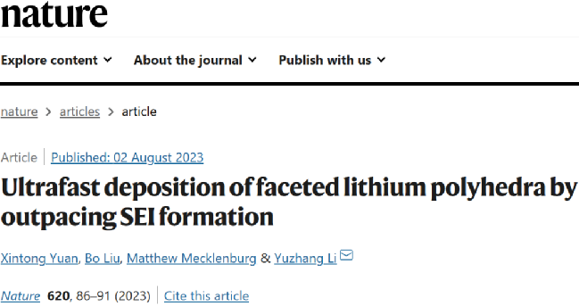 Xintong Yuan, Bo Liu, Matthew Mecklenburg, Yuzhang Li✉, Ultrafast deposition of faceted lithium polyhedra by outpacing SEI formation, 2023, Nature.
