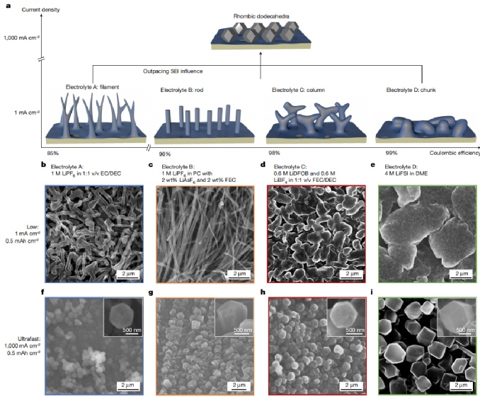 相關(guān)研究成果以“Ultrafast deposition of faceted lithium polyhedra by outpacing SEI formation”為題發(fā)表在Nature上,并被選為當(dāng)期封面!