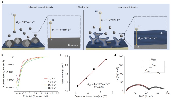 為了驗(yàn)證超快電流密度下的鋰沉積在沒(méi)有SEI影響的情況下進(jìn)行,作者在正常和超快電流密度條件下測(cè)量了從體相到沉積金屬鋰表面的鋰傳輸過(guò)程。其中,固體(SEI)和液(電解液)相中的Li+擴(kuò)散系數(shù)(DLi+)有明顯差異,并且經(jīng)常按數(shù)量級(jí)變化(圖3a)。為了測(cè)量超快電流密度條件下的Li+輸運(yùn),作者進(jìn)行了10~30 Vs-1的線性掃描伏安法(LSV)實(shí)驗(yàn)(圖3b)。
