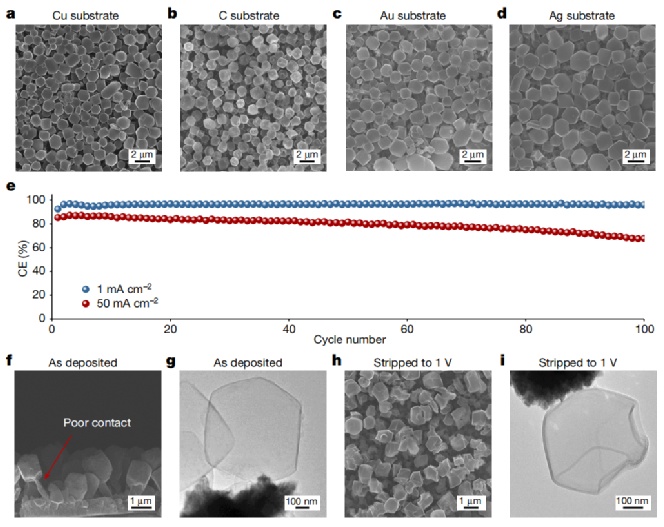 因此,作者成功地以50 mA cm-2的電流處沉積了Li菱形十二面體,容量為0.5 mAh cm-2相比之下,在1 mA cm-2處觀察到柱狀的Li形貌,其容量和電解液化學(xué)性質(zhì)相同。這一超高電流密度的發(fā)現(xiàn)顛覆了傳統(tǒng)觀點(diǎn),即高電流密度可能促進(jìn)Li枝晶生長(zhǎng)。相反,本文證明只要避免質(zhì)量輸運(yùn)限制,沉積速率可以超過(guò)SEI的形成,超高電流密度就可以使Li菱形十二面體生長(zhǎng)。此外,作者發(fā)現(xiàn)在50 mA cm-2處,無(wú)論襯底是疏硫還是親鋰,菱形十二面體結(jié)構(gòu)都獨(dú)立于集流體襯底(圖4a-d),這一發(fā)現(xiàn)與傳統(tǒng)理解形成了鮮明的對(duì)比,即襯底在正常電流密度下對(duì)金屬沉積的形貌有明顯的影響。