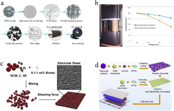 聚合物纖維化:Maxwell公司開發(fā)了一種用于超級(jí)電容器電極制造的創(chuàng)新聚合物纖維化技術(shù)。該技術(shù)利用可纖維化的聚四氟乙烯(PTFE)在高剪切力下形成纖維,將活性材料顆粒連接在一起,并通過熱壓形成自支撐的電極膜。這種技術(shù)可替代傳統(tǒng)的SC工藝,并與商業(yè)鋰電池生產(chǎn)設(shè)備兼容。Zhou等人成功地將這一技術(shù)擴(kuò)大到試驗(yàn)階段,用于制造磷酸鐵鋰(LFP)電極(圖2a)。陰極密度制造幾乎是SC電極的1.6倍。Zhang等人研究了基于PTFE的SF陽(yáng)極與不同碳材料的穩(wěn)定性。硬/軟碳陽(yáng)極表現(xiàn)出良好的循環(huán)壽命。Maxwell公司將基于PTFE的SF工藝擴(kuò)展到NMC和LIBs的石墨陽(yáng)極的制造(圖2b)。NMC/石墨電池在高負(fù)載的情況下表現(xiàn)出高倍率和良好的循環(huán)壽命。增加PTFE的纖維化程度是提高自承式電極膜機(jī)械強(qiáng)度的最有效方法之一。Zhong等人采用了不同的方法,如高溫、化學(xué)品和潤(rùn)滑來(lái)激活PTFE,以提高電極膜的機(jī)械強(qiáng)度。Hippauf等人將這種可擴(kuò)展的SF工藝用于全固態(tài)電池(ASSBs)的NMC電極制造(圖2c)。電池顯示出良好的循環(huán)穩(wěn)定性,在0.7 mA/cm2的電流下100次循環(huán)后,容量保持率為93.2%。用類似的方法,也制造出了具有代表性的固體電解質(zhì)膜,在室溫下顯示出低厚度和高離子傳導(dǎo)率(圖2d)?蓴U(kuò)展性和兼容性使聚合物纖維化技術(shù)有希望取代目前的SC工藝。然而,可用粘結(jié)劑到目前為止只有PTFE。非常有必要為不同的電池系統(tǒng)開發(fā)具有廣泛電化學(xué)窗口的可纖維化粘結(jié)劑。