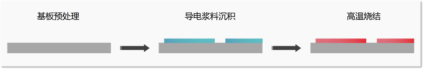 厚膜法是在基板上通過(guò)絲網(wǎng)印刷技術(shù)、微筆直寫(xiě)技術(shù)和噴墨打印技術(shù)等微流動(dòng)直寫(xiě)技術(shù)在基板上直接沉積導(dǎo)電漿料,經(jīng)高溫?zé)Y(jié)形成導(dǎo)電線路和電極的方法,該方法適用于大部分陶瓷基板。