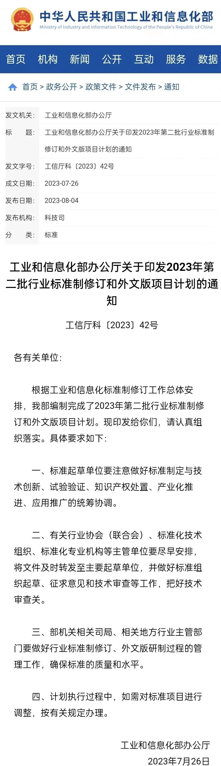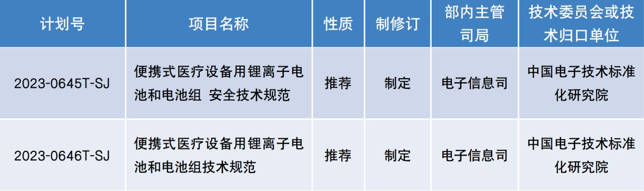 中國粉體網(wǎng)訊 根據(jù)工業(yè)和信息化部2023年8月4日印發(fā)的《工業(yè)和信息化部辦公廳關(guān)于印發(fā)2023年第二批行業(yè)標(biāo)準(zhǔn)制修訂和外文版項目計劃的通知》(工信廳科〔2023〕42號),由中國電子技術(shù)標(biāo)準(zhǔn)化研究院(賽西,CESI)歸口并組織起草的兩項行業(yè)標(biāo)準(zhǔn)《便攜式醫(yī)療設(shè)備用鋰離子電池和電池組 安全技術(shù)規(guī)范》(2023-0645T-SJ)和《便攜式醫(yī)療設(shè)備用鋰離子電池和電池組技術(shù)規(guī)范》(2023-0646T-SJ)計劃正式下達(dá)。