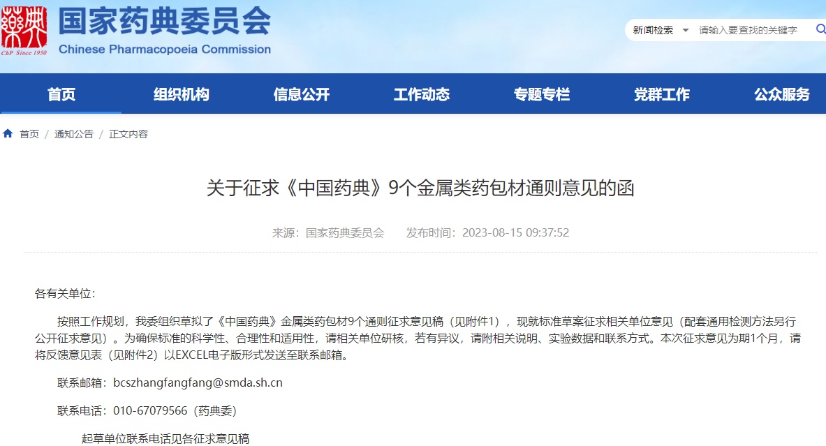 中國粉體網訊 8月15日,國家藥典委官網發(fā)布《中國藥典》金屬類藥包材9個通則征求意見稿,本次征求意見為期1個月。