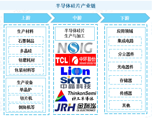 我國半導(dǎo)體硅片產(chǎn)業(yè)鏈涉及電子級(jí)多晶硅制造、半導(dǎo)體硅片制造、半導(dǎo)體器件制造等環(huán)節(jié)。其中,上游半導(dǎo)體硅片原料電子級(jí)多晶硅主要依賴進(jìn)口,僅有少有的幾家公司能夠批量生產(chǎn)。
