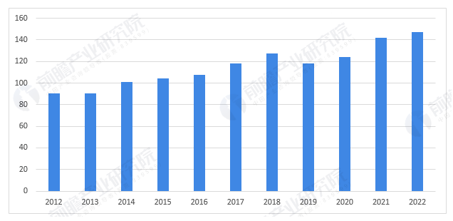2012-2022年全球半導(dǎo)體硅片出貨面積(單位:億平方英寸)
