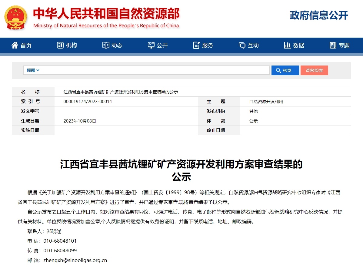中國粉體網(wǎng)訊 10月9日,國家自然資源部官網(wǎng)顯示,自然資源部油氣資源戰(zhàn)略研究中心組織專家對《江西省宜豐縣茜坑鋰礦礦產(chǎn)資源開發(fā)利用方案》進行了審查,滿足關于鋰礦資源合理開發(fā)利用“三率”指標要求,已通過專家審查,現(xiàn)將審查結果予以公示,公示期5天。