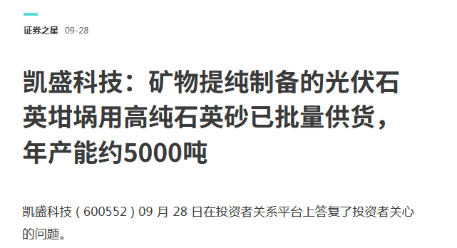 凱盛科技:礦物提純制備的光伏石英坩堝用高純石英砂已批量供貨,年產(chǎn)能約5000噸