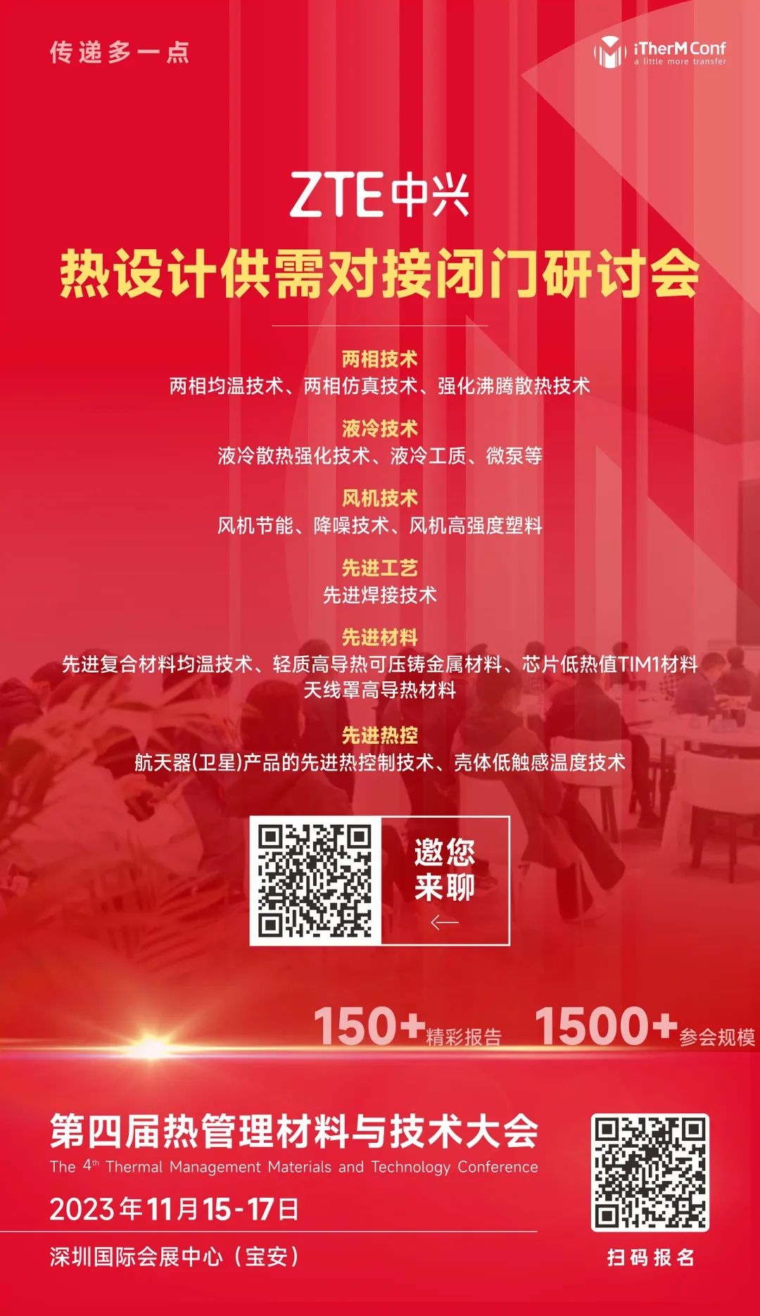 “第四屆熱管理材料與技術大會”聯合中興通訊設置供需對接會,從中興通訊的應用需求出發(fā),直面用戶單位針對新材料、新技術以及工程方案探討熱管理解決方案,期待您的蒞臨!