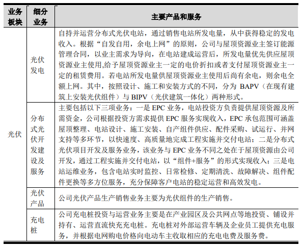 據(jù)了解,芯能科技是目前國內(nèi)最早從事分布式光伏開發(fā)的企業(yè)之一,是一家以投資運(yùn)營自持分布式光伏電站為核心業(yè)務(wù)的清潔能源服務(wù)商,主營業(yè)務(wù)包括分布式光伏電站投資運(yùn)營(自持分布式光伏電站)、分布式光伏項(xiàng)目開發(fā)建設(shè)及服務(wù)(開發(fā)+EPC+運(yùn)維)、光伏產(chǎn)品生產(chǎn)銷售、充電樁投資與運(yùn)營。