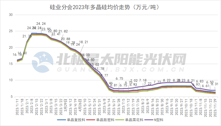 在業(yè)績變動說明中,產(chǎn)業(yè)鏈價(jià)格波動是多數(shù)企業(yè)業(yè)績不理想的原因。目前硅料價(jià)格仍處于下降通道,且有跌破6萬元/噸趨勢,單晶菜花料最低價(jià)格已經(jīng)來到5.7萬元/噸。