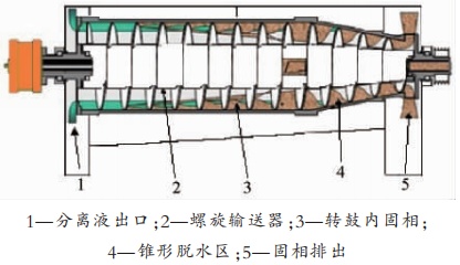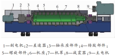 臥式螺旋卸料離心機(jī):臥式螺旋卸料離心機(jī)主要由柱-錐形轉(zhuǎn)鼓、螺旋推料器、行星差速器、擋料板、差速器、扭矩調(diào)節(jié)器、減振墊、布料器、外殼和機(jī)座等零件組成。轉(zhuǎn)鼓通過(guò)主軸承水平安裝在機(jī)座上,并通過(guò)連接盤(pán)與差速器外殼連接。螺旋推料器通過(guò)軸承同心安裝在轉(zhuǎn)鼓里,并通過(guò)外在鍵與差速器輸出軸內(nèi)在鍵相連。臥式螺旋卸料沉降離心機(jī)的主要技術(shù)參數(shù)為轉(zhuǎn)鼓直徑、長(zhǎng)度、轉(zhuǎn)速、分離因素、電機(jī)功率等。