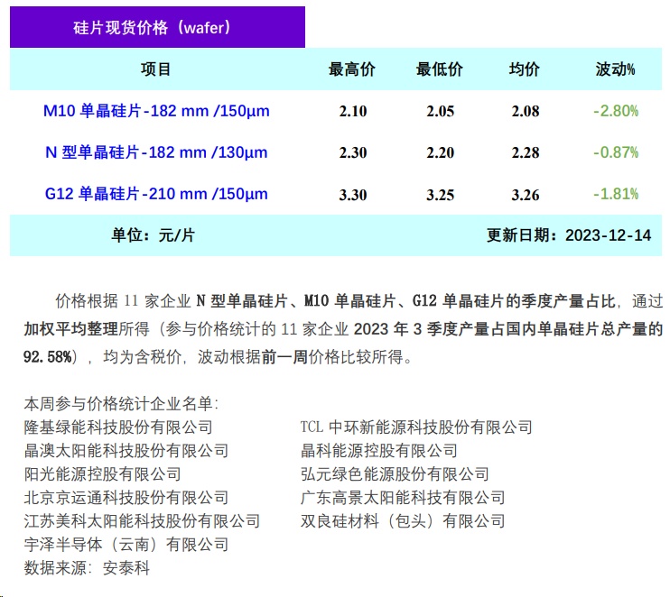 中國粉體網(wǎng)訊 據(jù)中國有色金屬工業(yè)協(xié)會硅業(yè)分會12月14日消息,本周硅片市場價(jià)格維持跌勢。M10單晶硅片(182 mm /150μm)成交均價(jià)降至2.08元/片,周環(huán)比降幅2.8%;N型單晶硅片(182 mm /130μm)成交均價(jià)降至2.28元/片,周環(huán)比降幅0.87%;G12單晶硅片(210 mm/150μm)成交均價(jià)降至3.26元/片,周環(huán)比降幅1.81%,N型硅片價(jià)格相對P型有所支撐。