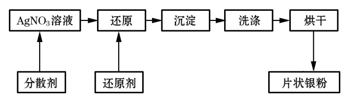 化學(xué)還原法制備片狀銀粉是不經(jīng)過球磨工藝,直接加入抗壞血酸、甲醛、維生素B2、過氧化氫、葡萄糖、維生素C、肼、乙二醇等還原劑直接還原銀鹽而制備出片狀銀粉的方法。